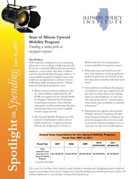 The Upward Mobility Program should be eliminated. Illinois taxpayers often struggle to fund higher education costs for their own families; they should not be funding higher education for state employees as well.